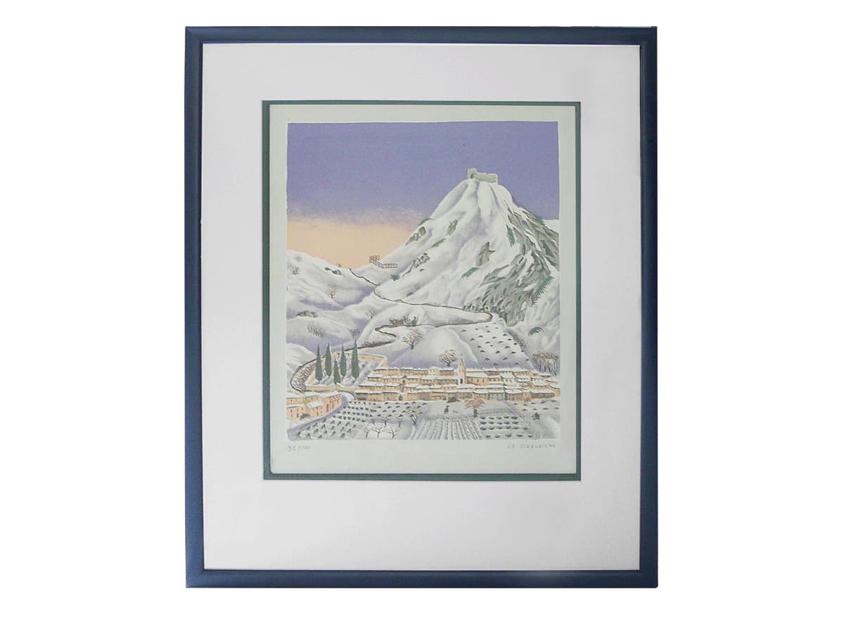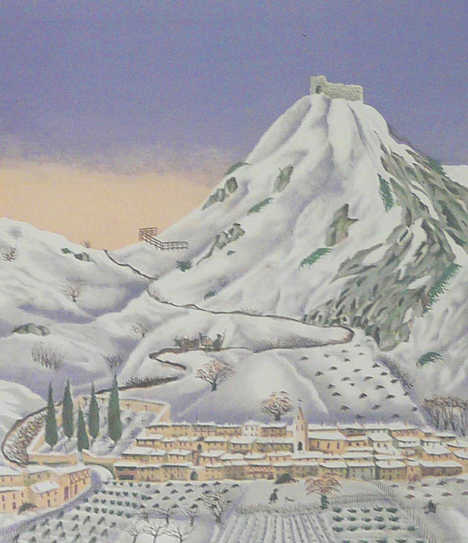 Lithographie Montségur sous la neige de Mady de la Giraudière.
